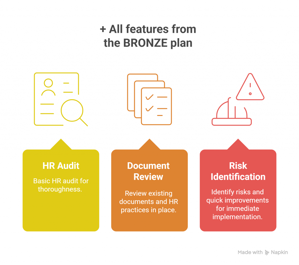 Value: Goes beyond the BRONZE audit with deeper analysis, helping companies lay the groundwork for scalable, compliant HR systems.